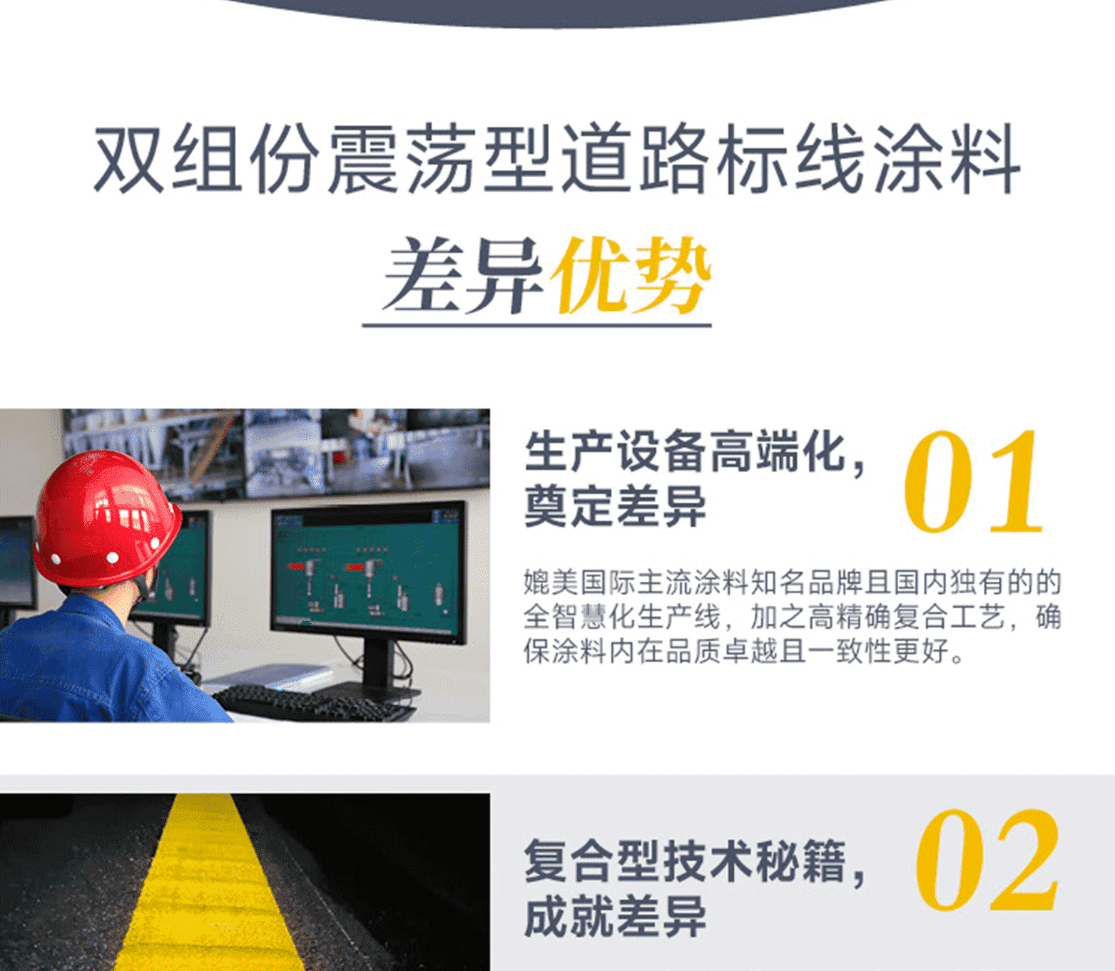 標線品質:進口基料、氯化鈦白/有機黃顏料、多重進口助劑、復合工藝、標準化檢測;標線特點:涂料細膩、抗污性強、覆蓋性高、耐磨耐候、施工性好、抗沉不起泡;